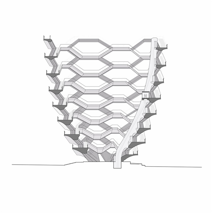 Vessel 的每一个部件,从扶手到节点都是由工厂定制完成。威尼斯专业制造商 Cimolai 生产75个巨型钢构件,从意大利分六次船运到哈德逊河,并现场组装三年。虽然建筑看起来尺度很大,但是具体设计完全按照人体尺度,这是一个为纽约人和游客设计的,可攀爬、探索和享受社区生活的简单结构,是生活的缩影。