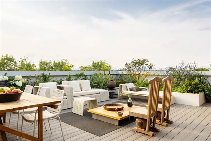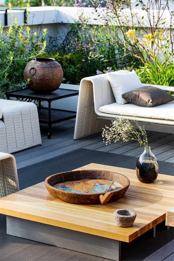 来到观景台,空间开阔,原木与米白色装饰,周围的绿植营造了大自然的氛围,可以和朋友一起喝茶聊天,一起团圆坐下享受这美好的休闲时光。