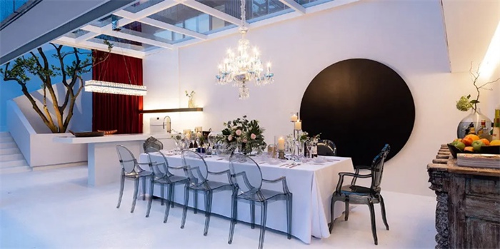 来到用餐区更是简单大方,用透明玻璃作为餐凳,彰显气质,绿植、插花、大白墙一点黑等的设计相结合,就像走进电视剧的场景,美中营造舒适和浪漫。