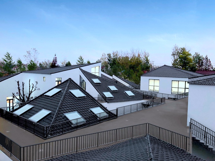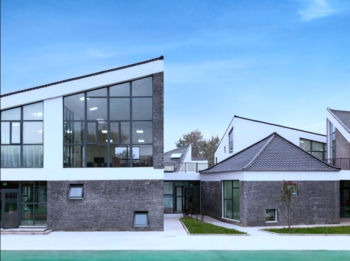 本次设计的关键点,是对尺度的把控。我们设计的组团式建筑,用若干“小屋式”结构分解了幼儿园所需的总建筑体量,并以一片多功能的户外活动场将每栋“小屋”集结在一起。这种室内外密切衔接、高度混合的空间关系,不仅呼应了乡村的原生肌理,对儿童早期教育而言更是十分重要的场所环境。正如“中国现代幼教之父”陈鹤琴所言:“大自然、大社会都是活教材”,儿童需要在与自然和社会的直接接触中、在亲身观察中获取经验和知识。而空间的设计者要为孩子们营造这种环境,创造这些机会。