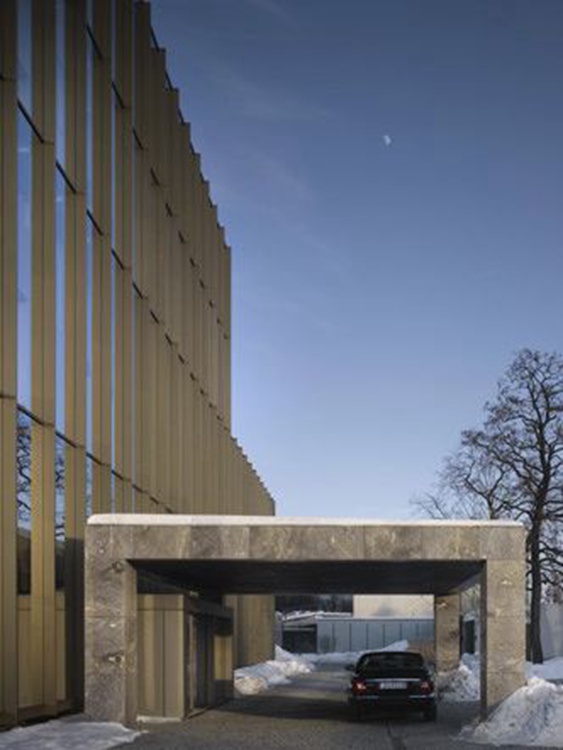 大使馆一面朝着Ulica Kawalerii,一面朝着一个公园,呈现出平静和正式的仪态。其悠久的形式是由一个阁楼主导,给人以新古典主义风范,修长的墙壁及环绕场地的围栏更是加强了这一效果。建筑在节能方面非常突出:玻璃立面充当一个双层表皮的外立面,它能在冬季为建筑提供足够的热能,同时在夏季帮助降温。外表层是铜色的铝制竖框和镜面玻璃,它们反射天空和周围的绿树。这一表层后面是更加可持续环保的窗户立面,它位于坚硬的柱子和拱肩之间,形成和谐的组合。建筑中苍白的彩绘让人记起Schinkel学校的抹灰泥的建筑,在欧洲位于Ul. Kawalerii的门楼直接通向大使馆。通过一条行车道可以进入被石头门廊和外墙包围的。一层公共空间为公共活动和展览保留,还有一个通往花园的咖啡厅。通过借道进入的公共等候区领事部和英国边境管理局的区域占据了一层的其余空间。大使馆行政办公室都位于一楼和二楼。装饰着吸声吊顶,地板铺有地毯,表皮为双层幕墙,办公室是安静并充满效率的场所。玻璃幕墙和两个大方种植庭院为工作区引入了充足的直射日光。阁楼的二楼是外交大使的套房,以及能够眺望两边广阔景观的屋顶露台。
