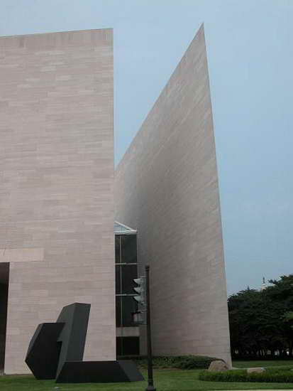 美国华盛顿国家美术馆东馆位于一块3.64公顷的梯形地段上,东望国会大厦,南临林荫广场,北面斜靠宾夕法尼亚大道,西隔100余米正对西馆东翼。附近多是古典风格的重要公共建筑。贝聿铭用一条对角线把梯形分成两个三角形。西北部面积较大,是等腰三角形,底边朝西馆,以这部分作展览馆。三个角上突起断面为平行四边形的四棱柱体。东南部是直角三角形,为研究中心和行政管理机构用房。对角线上筑实墙,两部分只在第四层相通。这种划分使两大部分在体形上有明显的区别,但整个建筑又不失为一个整体。