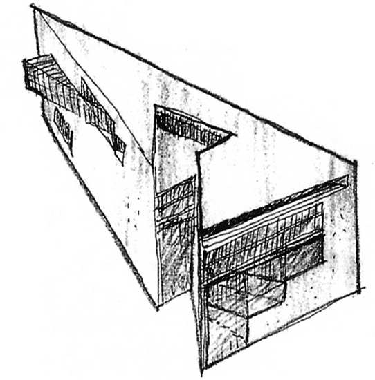 设计美术馆东馆是对贝聿铭的挑战。作为一名华人建筑师,他从未忽视自己同中国文化与历史的联系,而在建筑创作中,他则主张把中国建筑的内在精华融合在现代建筑之中。贝聿铭对三角形、由三角形延伸出来的埃及金字塔造型有独特的研究。几经琢磨贝聿铭突出奇想:一条对角线穿过这片梯形的直角顶点,将这片用地划为一个等腰三角形和一个直角三角形。这条线成为东馆设计的绝妙发端。
