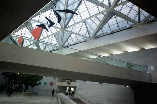 展览馆美术馆馆长J.C.布朗认为欧美一些美术馆过于庄严,类若神殿,使人望而生畏;还有一些美术馆过于崇尚空间的灵活性,大而无当,往往使人疲乏、厌倦。因此,他要求东馆应该有一种亲切宜人的气氛和宾至如归的感觉。安放艺术品的应该是“房子”而不是“殿堂”,要使观众来此如同在家里安闲自在地观赏家藏珍品。他还认为建筑应该有个中心,提供一种方向感。为此,贝聿铭把三角形大厅作为中心,展览室围绕它布置。观众通过楼梯、自动扶梯、平台和天桥出入各个展览室。透过大厅开敞部分还可以看到周围建筑,从而辨别方向。厅内布置树木、长椅,通道上也布置一些艺术品。大厅高25米,顶上是25个三棱锥组成的钢网架天窗。自然光经过天窗上一个个小遮阳镜折射、漫射之后,落在华丽的大理石墙面和天桥、平台上,非常柔和。天窗架下悬挂着美国雕塑家A.考尔德的动态雕塑。