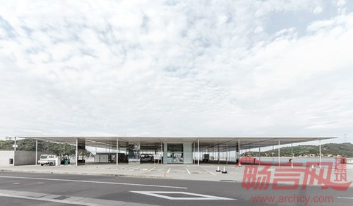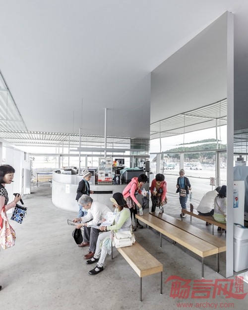 薄平的大屋顶、纤细的柱子、反光的镜面墙体及功能盒子使Naoshima Ferry Terminal给人轻薄、透亮的感觉。细长而优雅的柱子使视野通透,没有遮挡。镜面反射室内外的景色,对厚实墙体的存在起到消隐和模糊的作用。纤细的柱子、墙体及盒子的组合结构提供有效支撑作用的同时,很好地防止了屋顶被海风吹走。