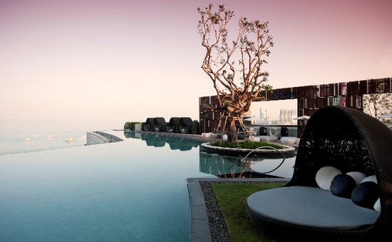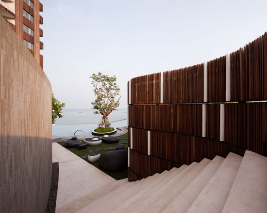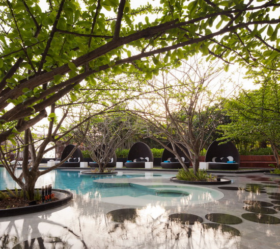 该酒店的景观设计就是由R.O.P完成,Pok Kobkongsanti是.R.O.P:terrains+open space的创始人,拥有15年的景观设计经验,2000年毕业于哈佛大学(Harvard University GSD),在美国和亚洲工作至今。擅长于简洁、优雅的景观设计,并不局限于“现代”范畴,为每一个场地打造独一无二的专有景观。达场地后发现三个重要的元素:(1)屋顶中央有个巨型天窗:可以将光线带到商场,不能承受任何荷载,不能作为公园的一部分加以利用;预算当中不包括装饰这个天窗的钱,所以天窗一半是玻璃一半是混凝土,设计师用假草皮覆盖了混凝土的部分。(2)左侧剩余的空间:天窗占了中间的区域,因此只能在天窗周边狭窄地区设计;区域如此有限,还必须为健身房和卫生间留出场地。(3)边缘不规则的屋顶:购物中心的内、外立面非常有意思;但不规则的边缘使设计要做到简洁很难。