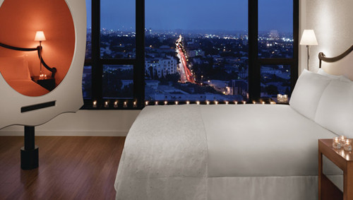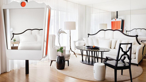 室内装潢就是根据作家刘易斯•卡罗尔著名的《爱丽丝漫游仙境》的续集《穿过透镜》为灵感而进行的室内装潢。Benjamin Noriega-Ortiz为房间布置了一个显眼的橘红色的镜子,转过来就是平板电视。房间里的每一个细节也都体现了设计师为你打造的颇有心思的奢华感,包括可持续使用的竹地板、埃及棉床单、淋浴及进口的洗浴设施。宽大落地窗能够看到洛杉矶的美景。