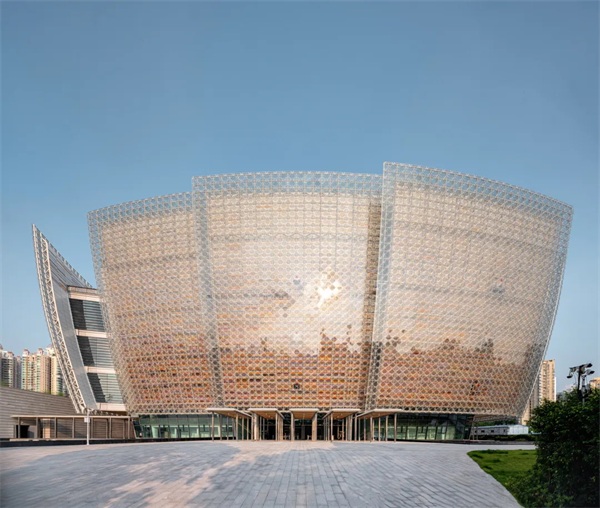 建筑以其颠覆性的材料应用,彻底打破了传统建筑表皮的认知边界。建筑造型以"水上绽放的英雄花"和"晶莹瓷器"为意象,却以完全超乎想象的方式呈现——十二组光伏玻璃与彩色铝板构成的双层复合幕墙,不仅在视觉上随光线变幻出瓷器般的光泽,更在功能上实现了发电、隔热、通风的三重突破。
