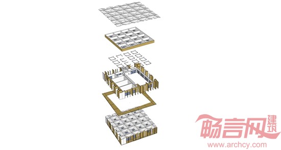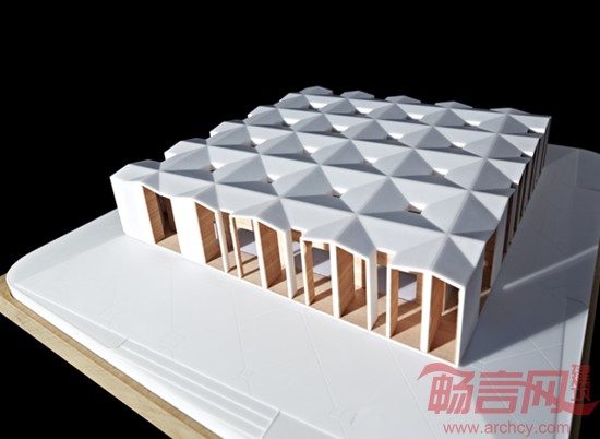 根据设计要点,我们提出了一个由10米×10米单元排列形成的60米×60米的正方形平面,每个单元由中间的一个天窗和四坡屋顶组成。