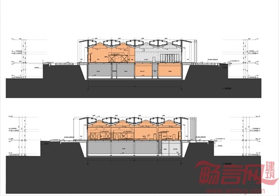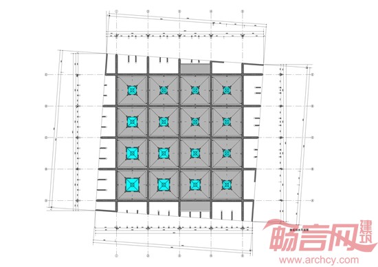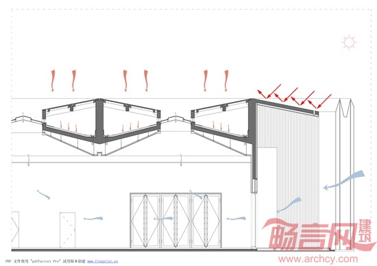 措施1:由于该建筑是一个单层建筑,因此屋顶的保温隔热是一个不好解决的问题。因此我们在四面坡的屋顶上又增加了一层砼的反向四面坡屋顶,同时将2米高的大梁隐藏在两层屋顶之间。