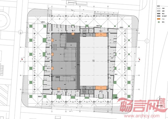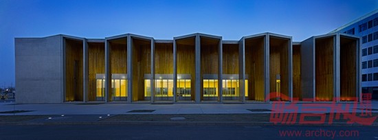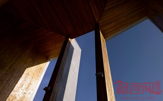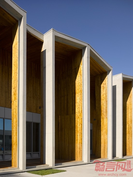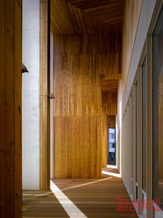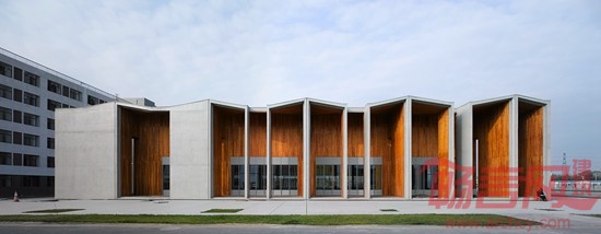 措施3:在建筑外侧设置了一层外廊,为外侧的大窗户提供了遮阳,同时也为店铺和学生活动提供了一个半室外空间,外廊的另一个重要的功能是为大跨度的梁提供了支撑。另外为了丰富外立面,将外廊处理成在轴网旋转后将外侧单元进行切割的形式。该建筑为钢筋混凝土结构,为了表达建筑几何的逻辑关系,屋顶、切割面为清水混凝土,切口内为木质外墙。