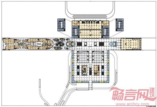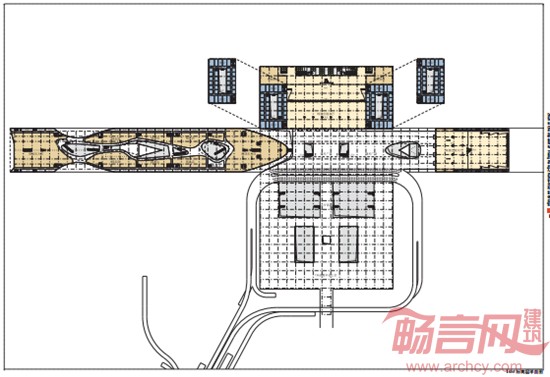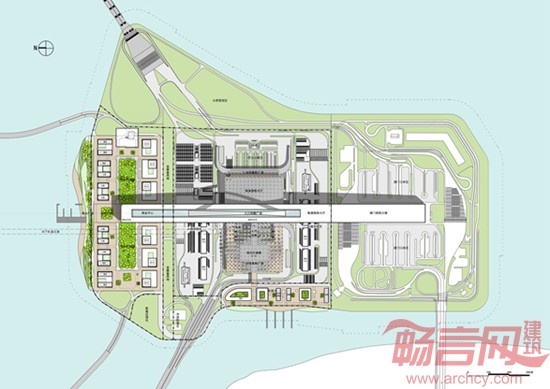 口岸建筑纵贯南北的一字布局将北部综合配套、珠海口岸、澳门口岸连为一个整体,为区域内众多建筑、设施道路桥梁提供了一个强有力的中心。一字型建筑体量在高度上依据功能需求而变化,结合通关无柱大空间需求,呈两端低中部高的弓形趋势,与拱形悬索结构呈现更具张力的结合。