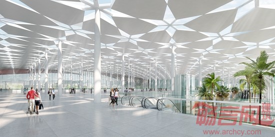 以珠海市花为圆形的伞状结构单元格局功能需求起伏变化跨越用地东西,将交通中心,人行广场、旅检大楼连接成一个整体。独立的花型单元集结构、照明、遮阳、扩声、安防于一体,满足交通中心广场的各类需求。而起伏变化的花型单元构成的整体,犹如一片“花海”流经“拱桥”之下。