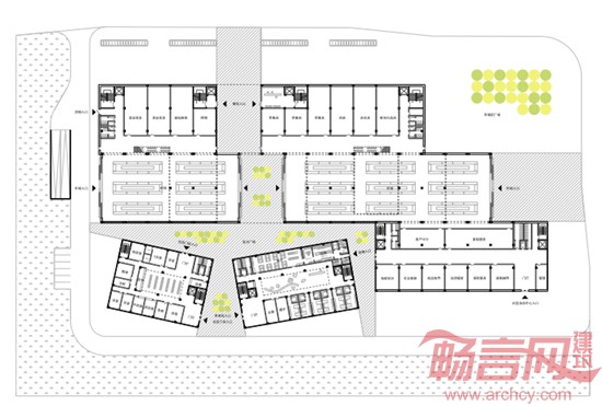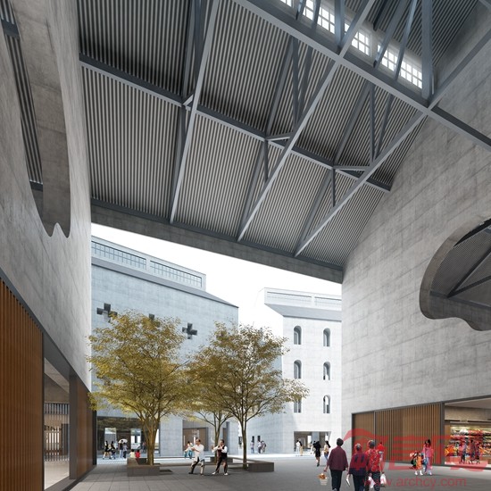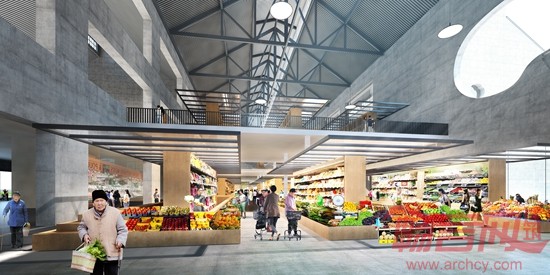 社区活动中心,社区门诊和养老院围绕着中间的菜市场布置,零售商业与菜市场相互穿插,满足了城市复杂性功能的需求。同时,将街道、广场等公共空间元素引入并叠加,为不同使用需求的社区居民提供多种可能性,使邻里中心成为满足整个社区最基本生活要素的活力中心。