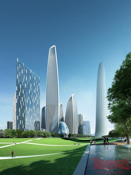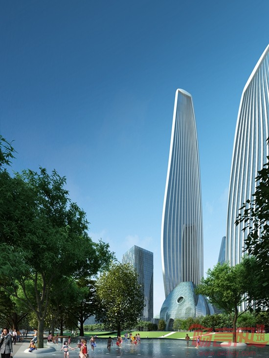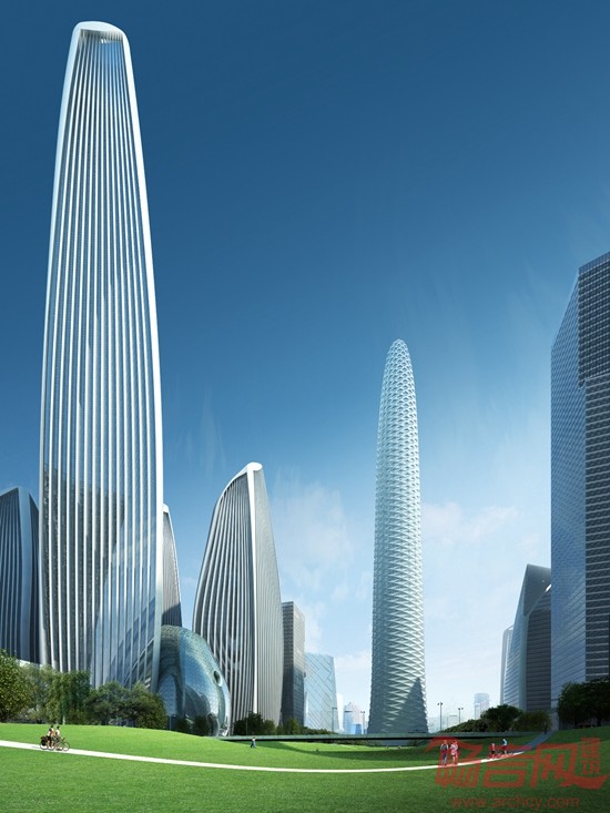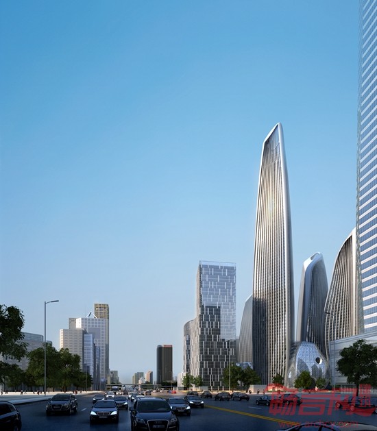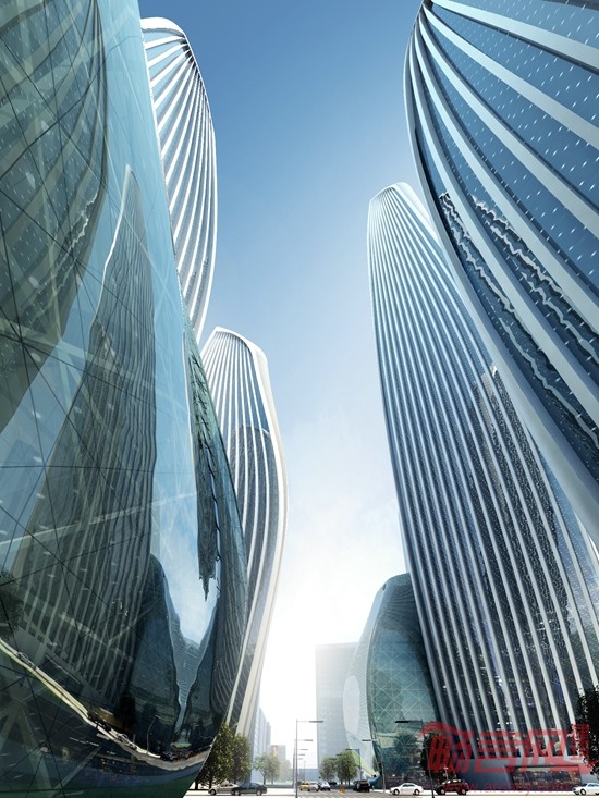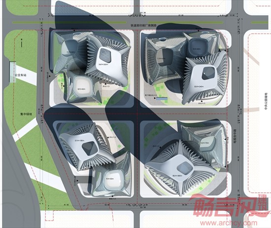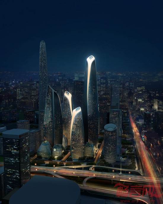 鲜明的建筑形象:也许一幢建筑对于业主来说,形象、造价、功能都是其关心的内容,,然而对于一个城市来说,一幢建筑对城市的贡献主要取决于它的造型以及其形成的开放的城市空间。CBD核心区是奥运后北京现代化建设的重要地区,在其中建设的重点项目应具有鲜明的建筑形象。Z3,Z4,Z5,Z6地块的建筑造型设计以绿叶为原型,形成活跃的、富有张力的建筑外形。在这个富有未来感的造型基础上,我们利用兼有外遮阳作用的结构柱形成垂直律动的线条,更增添这组建筑的美感。入夜之后,特别设计的夜景,在空中形成一组奇妙的凤尾造型,将为城市的夜空贡献一副优美的景观。本方案的绿叶造型同时有利于减少风荷载对高塔结构的影响。另外,由于本地块的建筑在高度上明显低于最高建筑,其独特的造型不会对区内最高建筑造成威胁。裙房结合主塔的体型设计成占地较小的幼芽造型。