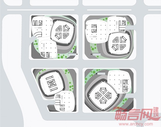 四个地块作为一个组团设计:Z3,Z4,Z5,Z6地块位于核心区的西侧,西临东三环,从城市的西、西北、南、东南均能较清晰的看到这组建筑,特别是从长安街、天安门广场向CBD眺望,这组建筑对于该区域非常重要。从上海陆家嘴的实践来看,为了从城市主要视点外滩看陆家嘴时形成错落有致的城市景观,两幢最高的建筑前端布置了一些较低矮的建筑,但由于两幢标志性建筑不能对前端建筑进行控制,于是使其标志性受到影响。而本区内的建筑布局与陆家嘴颇为相似,因此我们认为将这四个地块的建筑设计成一组,可以在城市大尺度上观看CBD核心区时,使前景建筑和标志性建筑更和谐。另外,组团和个体相间布置,更有利于形成区域内建筑形态的多样性。