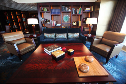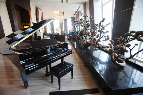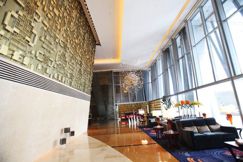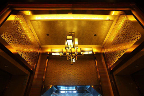 主楼大厅极尽奢华,墙体上是仿古的窗棂造型,密布的方形装饰上贴有24K金箔,另一面玻璃隔墙上贴满数百个打磨成圆形的石子,与大厅的金碧辉煌相映成趣,大厅四个水晶灯据称从捷克进口,价值不菲。