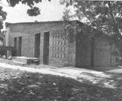 贝克非常钟情于手工制作的砖,他深入学习当地传统的建造工艺,并且尝试多种经济的砌筑方式,他发展了当地穿孔式砖格的做法,用最有效的手段同时顺应了气候和文化的要求。在建筑中大量使用穿孔式砖格取代玻璃窗,不仅大大降低了造价,而且有利于室内外通风并减少日照,这十分适应喀拉拉的湿热气候。同时由各种图案组合而成的砖格还在空间塑造上产生了强烈的光影效果,使一座座建筑物犹如精美的艺术品,令人回味无穷。这也几乎成了贝克作品的一个标志。在其成名作“发展研究中心”(Center for Development Study,1971)中,就大量使用了砖格这种独特语汇(图1)。良好的建造工艺和细部处理以及建造技术都反映出贝克几十年一贯的追求与探索。整个校园坐落于一座小山上,以一座12边形的7层图书馆作为统领整个建筑的制高点,环绕其四周的有教室和行政中心。在核心区外围又相继建成了计算机中心和箭头状的多功能厅,它们无一例外地使用了砖格墙。置身室内,变幻迷离的光影给发展研究中心这一现代化建筑披上了一层神秘的面纱。砖格迷人的空间效果在私人住宅和教堂里也都得到了淋漓尽致的发挥。