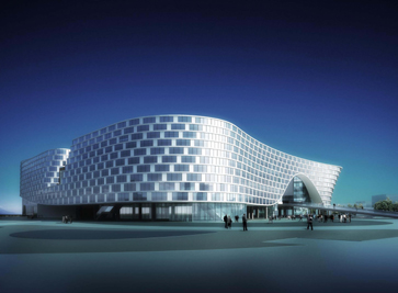 三个漂石状建筑的功能分别是:游泳池,体育馆和娱乐中心。游泳池与体育馆由一条凸起的走道连接,构成了两座建筑的对话。徜徉于走道之上,给人感觉如同攀附于两座巨石之上。临近的娱乐中心也在底层营造了饶有趣味的局部空间。屋顶由矩形天窗装饰,其内的行人使之生气勃勃。漂石表面采用钛锌合金的材质,采集了光线并在这几幢建筑物之间营造出了趣味盎然的光反射。