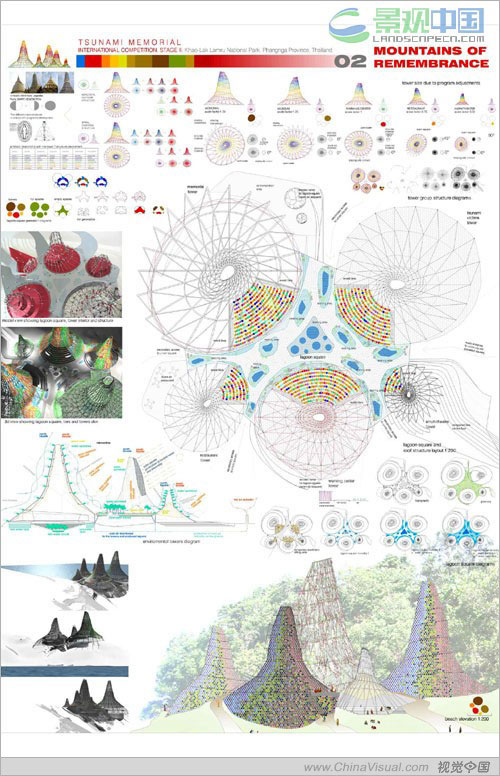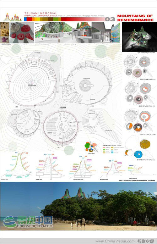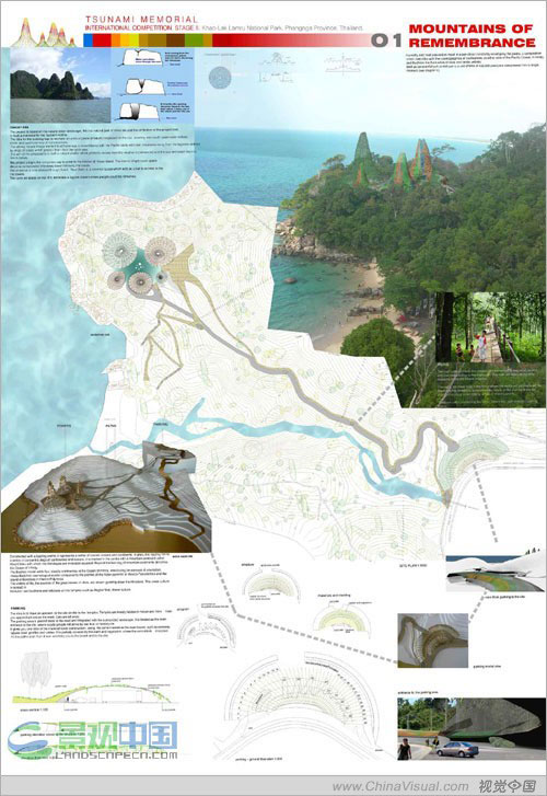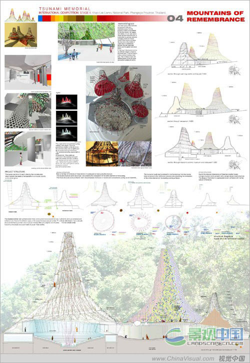 据泰国海啸纪念碑设计竞赛官方网站消息,经过为期3天的紧张评选,7位国际评委从分别来自芬兰、美国、西班牙、中国、澳大利亚的5个决赛方案中,一致投票选出了比赛最终设计方案,最后由来自西班牙的ana somoza等15位年轻建筑师团队设计的c号方案“纪念的山脉”(mountains of remembrance)胜出。据介绍,该方案的灵感源自那些在泰国南部海岸耸立的石头,与塔式寺庙建筑相像,它将会成为博物馆或其他活动场地的上盖。泰国政府将依照最终设计方案,在攀牙府面向安达曼海的考拉山上兴建死难者纪念碑,纪念在这场世纪大海啸中罹难的逾22万人。