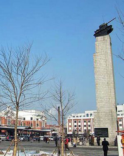 苏联红军阵亡将士纪念碑位于沈阳站站前广场中心,正面直对中华路,于1945年8月下旬兴建,同年10月落成,是为纪念在解放沈阳战役中牺牲的苏军坦克部队将士而立。纪念碑碑身为方柱形,用花岗岩条石砌筑,通高24.27米,分碑顶、碑身、基座三部分。碑身高约18.4米,正面最上嵌镰刀斧头立体五角星,中嵌苏联国徽,下嵌"光荣属于伟大的苏军"俄语碑文,皆铜铸。碑身左右侧下方嵌铅质镰刀斧头大勋徽,下嵌铜铸烈士姓名。碑顶安放一辆青铜铸造的坦克模型,高4.5米。