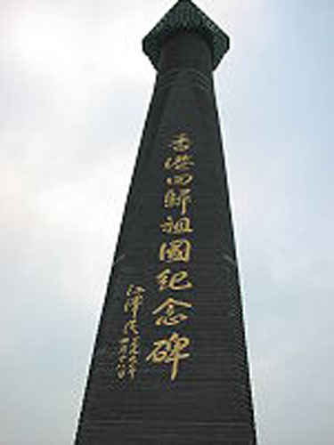 香港回归祖国纪念碑位于香港会议展览中心北面广场,与坐落广场东北面的“永远盛开的紫?;?rdquo;雕塑相互辉映。纪念碑高20米,宽1.6米,由基石、柱身和柱头三部分组成。 纪念碑柱身正面刻有国家主席江泽民亲题【香港回归祖国纪念碑】碑名?;髁矫娣直鹂逃兄形谋募坝⑽囊氡?。