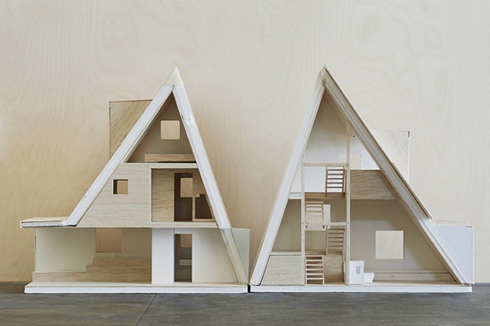 住宅位于森林线,看起来像从草坪上升起的梯田。 住宅从里到外都由木头建成。屋内,天花板、墙壁和木板贴有一家关闭的木制拼图工厂里的胶合板。门和窗户是二手的,家具就地用胶合板制成。住宅架构由木制横梁搭建而成,从底向顶形成一个A字形。屋顶和墙壁的材质是瑞典松树。