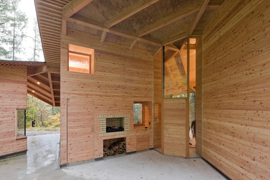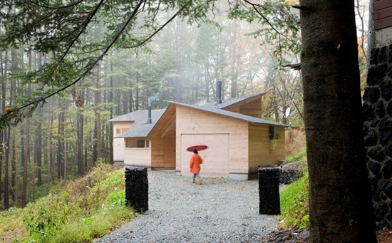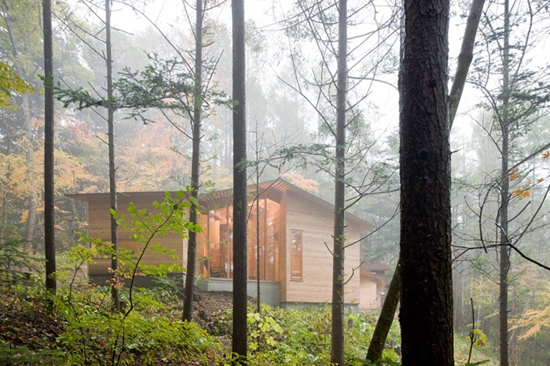 施工不复杂,建立在日本传统工艺上,工人可以熟练建造。有5个单坡屋顶,日本落叶松复合墙板。房屋的大小根据功能和场地坡度决定,每个都有独特景观。房顶的坡度也不一样。房间之间有着仿若街道的公共空间,尺度与城市小巷相近,这里可以作为客厅或者交通空间。屋顶连接和曲折的形式造就了内外不同的空间。