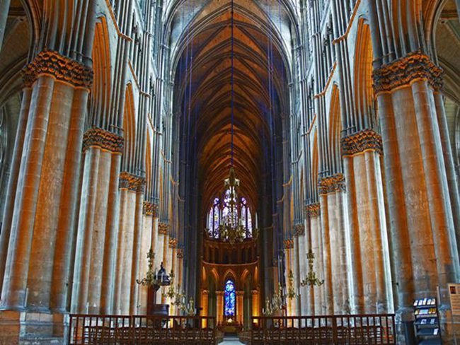 巴黎圣母院主殿翼部的两端都有玫瑰花状的大圆窗,上面满是13世纪时制作的富丽堂皇的彩绘玻璃书。沿着阁楼往上走,就能看到巴黎圣母院著名的大钟,这座钟就是雨果小说《巴黎圣母院》男主角卡西莫多敲的那座钟,货真价实,并没有毁于战火或者大革命,它和巴黎圣母院一起见证着法国千年的风风雨雨。但愿经历大火,这座钟仍旧能敲响。