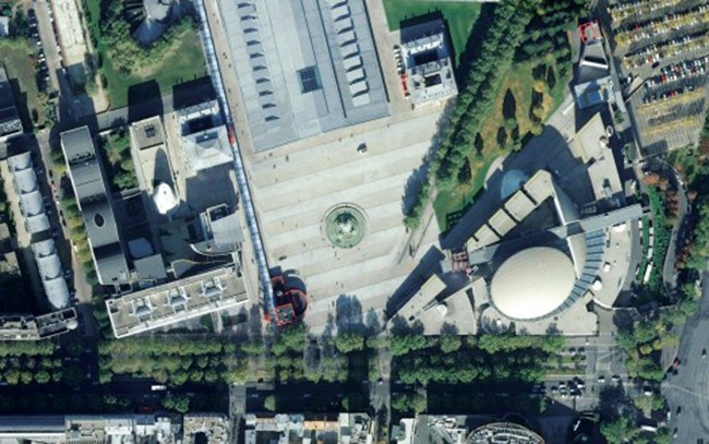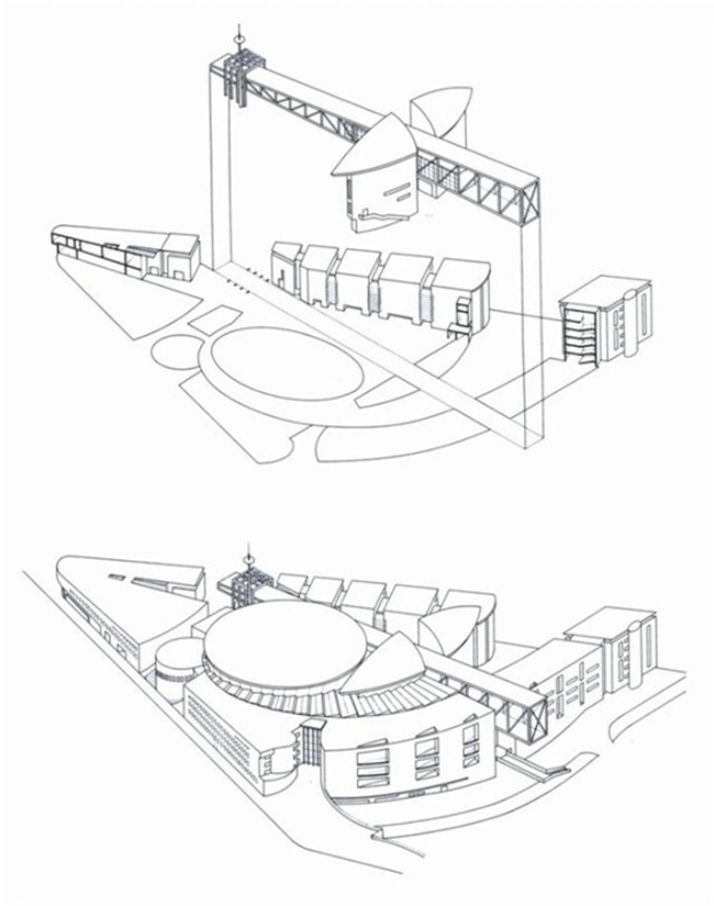 拉维莱特公园的南部入口处,巴黎音乐城的东西两翼遥相相望,与场地现存的拉维莱特大展览厅(Grande Halle)共同围合出一个三角形的大广场同时向公园与城市打开。不对称的设计减弱了拉维莱特公园入口的巨大尺度,同时也是大展览厅历史轴线与公园流动轴线共同作用的结果。