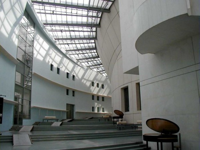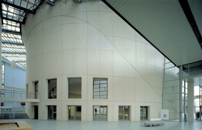 东西两翼空间处理上有相似之处:所有的功能空间形成不透明的独立体块,这是为了更好地进行声学处理,这些体块的体积和形态都有很大区别,它们之间通过明亮通透的交通空间相连,阳光通过这些空间渗入到建筑中,同时带来了不同的景观。
