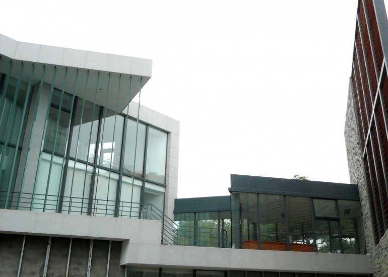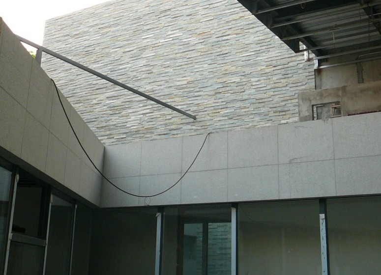 古语云:“半亩营园”,意在表述通过文人的思巧,极小的空间也可以成为一个园。蔡氏宅取名“半园宅”,有借其意境意。梯形的基地坐落于镇新区中心的住宅区西北角,紧邻公园的山丘。宅院讲述了一个散漫的空间线索。这个线索开始于靠近宅院主入口的餐厅。园林式的空间叙述带在首层串联着主人家日常起居的活动,如起居、接待、饮食、阅读,并半围合了首层的园子。叙述带由水平转而往上延伸出其他较私密的功能和非功能空间,包括卧室和附属的设施,半环绕着两层通高的起居室。叙述带最终结束于设在三层的另外一个起居空间。宅院的围墙则体现与主体建筑的非线性关系,并与周边的山景或邻家的宅院建立一种独特的对话。超大尺度的的磨砂夹胶玻璃片与细条形天然片岩的巨大反差强调了半园宅的自我矛盾性。