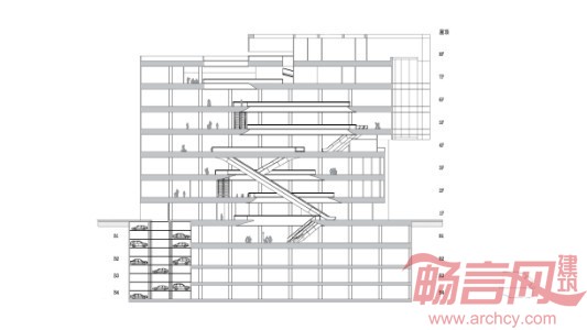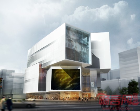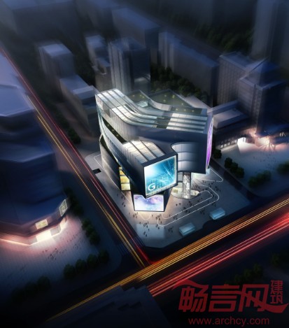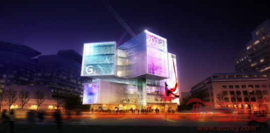 崇文门商圈沿崇文门外大街一线建筑体量庞大,建筑色调灰暗,建筑体型呆板,夜间照度过低,商业展示界面零散破碎。而本案基地面积较小,因此,我们希望通过各个方向适当的悬挑,最大化建筑体量。通过若干箱型建筑体量向各个路口的扭转,最大化其商业外部展示界面及品牌独立性与可识别性,这些独立的箱型体量内部临街一侧可布置以时尚服饰为主的主力店,令其拥有商圈内独一无二品牌形象。通过上述主力店的带动,每楼层背街一侧可布置普通商业店面,围绕宽敞的中庭布置大小不同的岛式经营区以提高每层商业空间的透明度。位于四层设空中广场以举办多种形式的大型商业活动,并有单向自动扶梯直接将人流输送至该层。首层迎向东北地铁方向设城市广场,以期留住往来人流并可用于举办户外商业活动。地下一层中庭内亦设有广场,紧邻地铁出入口,可举办中小型商业活动以吸引地铁出口的过往人流。围绕开放自如的中庭,各层间布置双向自动扶梯并形成强迫性流线,引导人们螺旋向上直至屋顶的花园式空中餐饮天街。位于天街中央可上人玻璃楼板亦是购物中心中庭的天窗,它将成为城中的一个特色景观,天街将吸引城中最时尚的潮流各式餐饮、酒吧,而位于临街入口处的两部直达景观电梯将确保餐饮天街的独立营业时段。