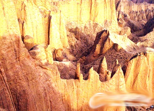 盘龙沟与龙湾沟我们徒步行走了几公里之后均由于塌方后大石头断路没有带绳子等爬山专业工具而放弃了走完全程的计划,但是山谷里那一线天的阳光,幽谷深处传来的鸟鸣,狭长的古道里不知名的动物尸体,除了我们俩人的脚步声寂静到正午的烈日下打着冷战,身边的石林在阳光下散发着明明暗暗的金黄,这份感觉也许终生不会忘记了。