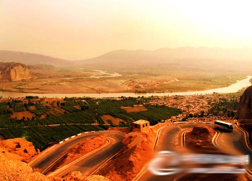 从黄河石林大门口买票后,乘坐小巴车依山下行要走22个大拐弯山道到龙湾村,龙湾村街面是水泥的路面,路旁的电线杆子上飘扬着黄河石林的小竖旗,村口随处可见电瓶车,搭乘电瓶车可随意漫游石林地质公园景区。村子里的姑嫂们早晨起来光梳头、净洗面后会将房前屋后都扫遍后,端着水盆将家前村路的路面上弹上水,打扫干净了之后再回家烧早饭。