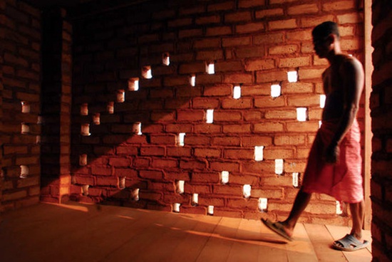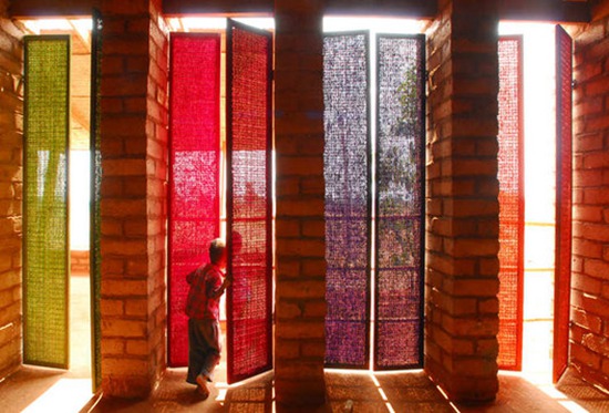 设计师使用当地的材料和技术,创造了一所美丽的建筑作品。暖红色的土胚墙和周围的环境相互辉映。土墙留有些许小孔,这样就可以避免阳光直射,风可以通过小孔进来,使建筑内部变得凉爽——晚上,学校就像灯笼一样发光。这个社区是开放的空间,为人们提供了一个舒适的户外场所。在很远的地方就能看到手工制作的彩色门,欢迎游客的到来。