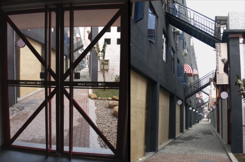 于是,我们今天看到的“OCT-LOFT华侨城创意文化产业园”是粗放的,也是多样的。灰色的水泥墙,高敞的空间是所有建筑的特点,但每一个创意机构走进去都有不同的风格。园门的左手边,一条“南中国青年建筑师设计作品展”的横幅占据了半面墙壁,里面挂满了设计图纸,粗糙的水泥地面和摆在地上的红砖充分显示出年轻人的不羁。而在园区里面,同样是设计图纸的展示,放置在香港PAL设计事务所里,就显得雅致而理性,除了陈列在四周的展示板,最引人注目的就是位于大厅中央的金属外壳大箱子,只有走近去,推开门,你才能发现,这其实是100平米的一个小型下沉式演讲厅。从这个明亮的空间走出来,对面就是雅库艺术中心,暗淡的灯光打在水泥的墙面上,营造出一种诡异的冷酷。陈列其间的当代艺术品,也自然地多了一份震慑人心的吊诡。