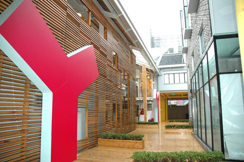 原来的印刷厂前面很混乱,有卸货台,有很多自行车堆在那里,整个环境里最珍贵的是几棵很大的松树,挂牌?;さ哪侵帧N揖拖肴绻颜飧龉こЦ某砂旃?,可以把它和已经建好的外研社办公楼连起来,这些松树就是一个共享的环境。所以就觉得应该架一座桥,架在什么位置呢?社长和我们很多人一起,围着那个楼转圈,转了半天我们发现树丛中有一棵小的柏树,在它上面刚好可以从三层的高度接过去一个桥。最后就选了这里,两边有大树,中间有小树,厂房的空间就打开了。