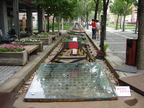 厂区内有原来用于运输的铁轨,横贯东北至地块中央,在小区规划上道路、建筑布局很难避让,就采用异地保留的方式。从社区入口一直延伸至中心运动会所的林荫步行道上,将一条被完整保留下来的带有旧枕木的铁轨穿插其中。不仅在室外,同时在社区会所及售楼中心内部中均移入了旧铁轨作为景观元素,但仍不失其原有的工业味道,让人能够感觉到历史的车轮。除了铁轨,水塔、烟囱等老工业建筑都保留渗透在景观规划中,成为场地景观的标志性要素。还保留了卷扬机、室外消火栓、钢架等设备,重新刷漆后犹如现代雕塑般,成为社区内耐人寻味的景观小品。