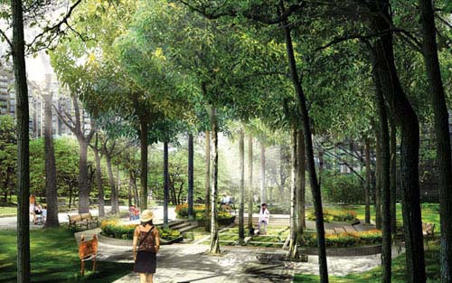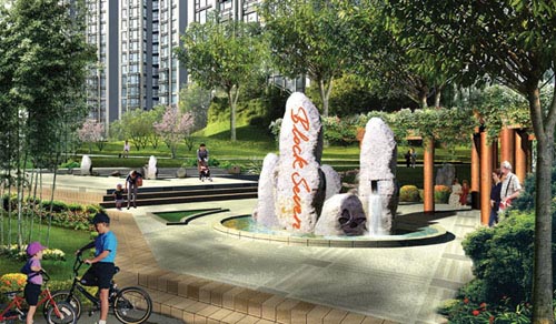 第七街区的楼间距宽达百米,中间是小区内9万平方米的园林景观。EDSA公司的第七街区园林景观风格是休闲自然的,抛弃了大量硬质地面广场的做法,师法大自然,将国外休闲度假区的做法引入小区园林,以求自然,柔软、亲切。这种设计是英国园林的手法与中国本地属性的完美结合,在北京,是难得的体验。