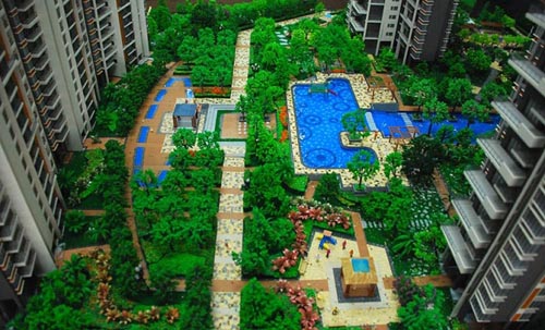 由于项目用地地形为中间较高周围较低,故建筑规划提出“半岛”的设计理念。在景观规划中我们延续并强化这一特质,并使之与“金域”所表达的现代东方风格形成完美的统一。