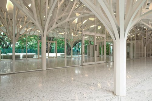 受雨树的启发,新结构系统在创造出色美学形象的同时也覆盖了大片空间。整体结构设计成钢树式样,其挑战在于如何将整个建造流程与当地的技术相结合。建筑师对整个建筑施工体系不是采用钢材弯曲技术,而是采用高温预热成型技术已达到高水平的施工精度。