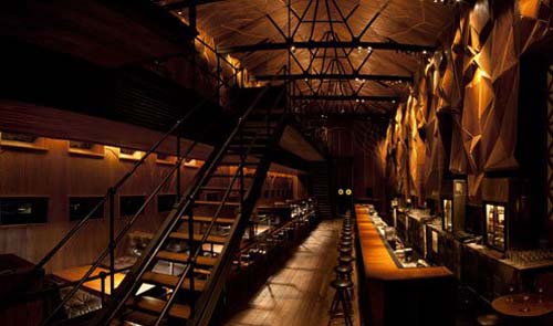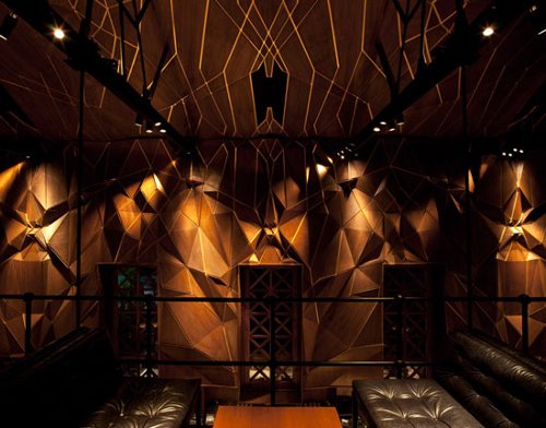 如此复杂的结构体系同时成为了空间的组织者,因为它在不同的空间范围内定义出来彼此分离的就餐空间(包括酒吧、餐厅、备餐区和宴会区)。高级酒吧室内的上层空间错综复杂地覆盖着三维的、细碎木板,抽象地表达了纵横交错的树枝肌理。