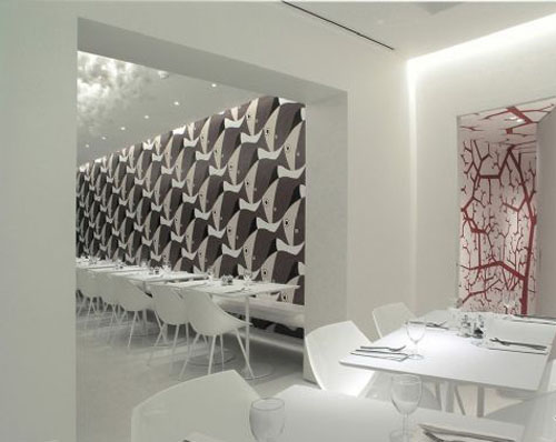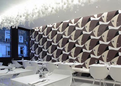 Olivomare餐厅由Pierluigi Piu完成的店面设计,为现代简约主义风格的设计。该餐厅的主色调为白色,设计师又加入了鱼图案的专装饰素来装饰墙面。最有特色的是主餐厅的一面宽阔的墙壁,整面墙上都绘上了由视觉艺术家Maurits Escher设计的大型图案,每种图案都由不同的颜色比例组成,垂直的排列在墙面上像极了一个巨大的拼图。
