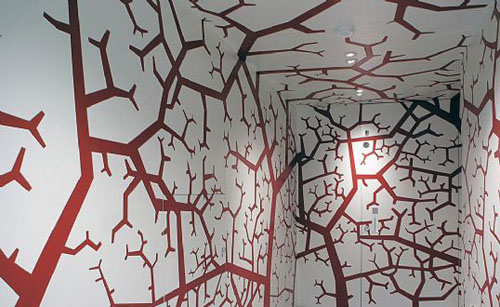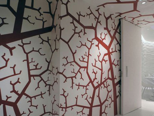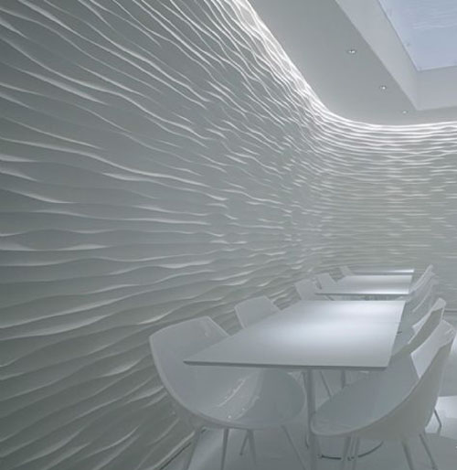 ?Olivomare餐厅-为了与整体相互辉映,在这个相同的空间里,在人造天花板上凹进去的凿沟里延伸下来的线性管状发光触角(由薄尼龙网制成),唤起了一只在浅滩游荡的水母或是???,同时,在菱形花格的全釉面将这个房间从入口走廊处分割开来,一些人可以依稀看到模糊的渔网造型。Olivomare餐厅-这种装饰模式是通过雕刻双层(白色和红色)不透明塑料板在墙体和天花板上,相互缠绕在一起,加上霎那间方向感迷失以及视觉上的审美效果,给人带来以惊喜的感觉。