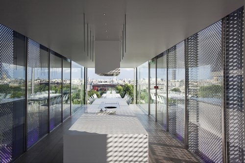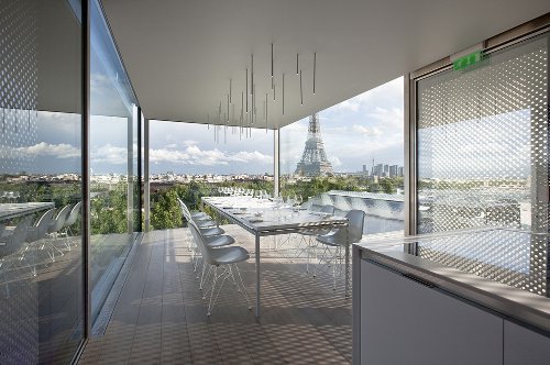 该餐馆能让12个人共进晚餐,并欣赏塞纳河和埃菲尔铁塔的全景。该餐厅由两个部分构成:一个玻璃座舱和一个穿孔金属丝网覆盖中央烹饪区。18米长的结构中的一部分是在法国北部的瑟堡船厂建造,并分成两个部分运到巴黎,然后在东京宫屋顶进行装配。彩色LED照明放在金属皮肤和玻璃核心体之间。餐厅采用白色的丽耐家具。