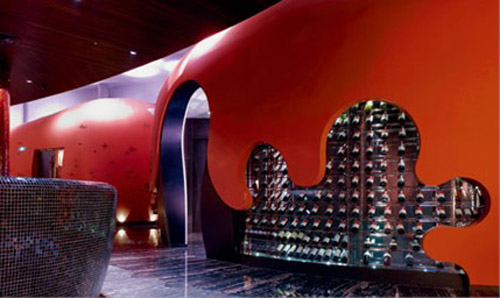 盥洗室的设计也是空间的一个亮点。设计师并没有因为盥洗室的空间似乎不那么重要而轻视它的设计。盥洗室的外形呈现和包房略有类似的异形处理,中轴对称,覆盖盥洗室的墙壁似乎从顶部留下来一般,曲线优美自然,中间未被墙壁覆盖的部分则被处理为酒柜的功能。