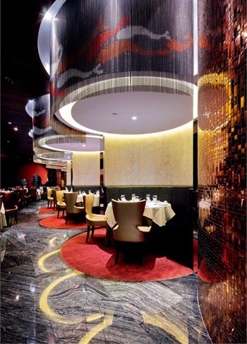 由于房间层高过高,设计师设计了高低落错的天花,设计展现空间的层次感。天花设计很重要的一个元素便是“鱼”形的元素。大堂内每一片用餐区都采用红色的地毯区分,顶部天花则设计了由金属丝串联的鱼形图案。不同色彩的链子相互串联,形成了红色和白色的鱼儿形象,链子略有扰动,鱼儿在其中似乎游动一般,带来了很强烈的空间感,与杭州西湖著名的“花港观鱼”一景遥相呼应。包房内同样延续了“鱼”的设计元素,墙壁镶嵌以大小不一的鱼形装置,生动活泼。