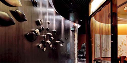 为了适应高达六米的层高,设计师将偌大空旷的空间分成若干个包房,缩小了空间的尺度,使之更加适合就餐的舒适氛围,并且保证了私密性。包房由腰果状的异形墙壁构成,包房入口也采用自由的曲线设计,如同山里的洞穴,设计营造出愉快难忘的就餐环境,曲线造型圆润流畅,以不规则的处理手法突出其奇特空间,着重形态设计,带起一种赏心悦目的飨宴新文化。每一间包房的设计都大不相同。包房外墙贴满大小不一的金属装饰,如绽开之桂花,造型简洁生动,充满活泼的青春朝气。地面的光线柔和地映射在弧形墙面桂花装饰投射下清晰的影子,重重叠叠,若隐若现。