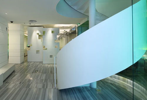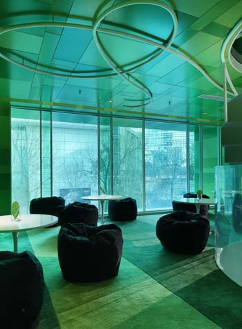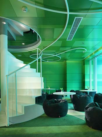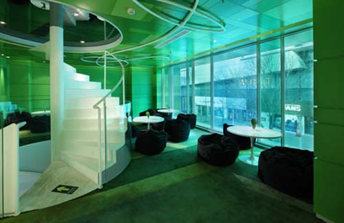 设计师针对都会商业区白领族群的用餐心理,精心布局四个属性独特的餐区,各个风格相同手法相异。餐区之间非常注意颜色与材料的运用,小阁楼餐区全绿色空间,白色的楼梯通天隐喻人们努力向上的必要性, 躺坐在小阁楼餐区的缆骨头上, 搭配一杯热奶茶,绝对独享属于自己的身心避风港。